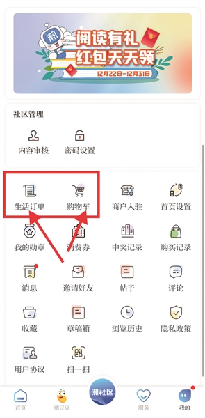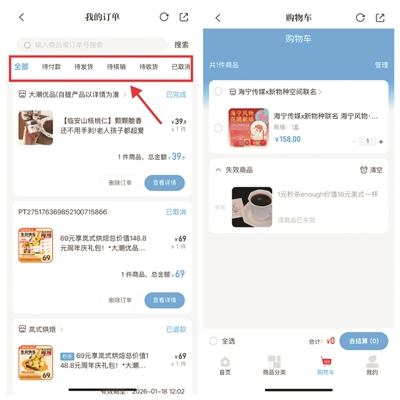 这次版本升级将“生活订单”“购物车”独立出来。在大潮商城的购物订单和加购商品,可在“我的→生活订单、购物车”查找订单。