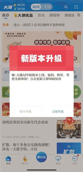 轻轻一点,新闻和生活触手可及。好消息来了,2025年12月29日起,大潮APP新版本发布。我们不止于传递资讯,更致力于链接新闻与生活,让每一次心动都能即刻行动。