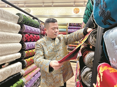 沈金良正在看漳缎服装面料。