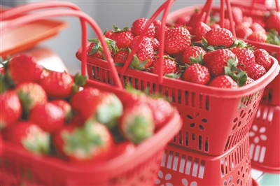大棚里,不少顾客正采摘草莓。“刚试吃了一个,特别甜,买一筐带回家吃。”顾客翁金芬说。“我们主要种植红颜草莓,它的肉质细腻,口感酸甜,色泽鲜艳光亮,很多人喜欢。”种植户杨辉指着一颗颗从绿叶间探出脑袋的草莓说,除了红颜草莓,园子里还种植了奶油草莓、雪里香草莓等品种。
