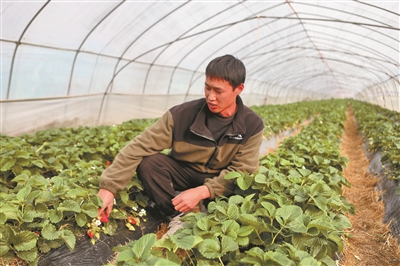 杨辉在大棚里查看草莓生长情况。
