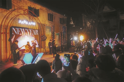 在盐官古城-潮乐之城,乐队演出引观众驻足欣赏。