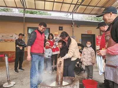 硖石街道农丰社区,孩子们体验传统民俗打年糕。