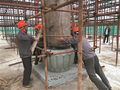 在袁花镇金庸故居修复现场,羊晨杰正在和老师傅们核对一块牛腿的雕样。牛腿是一种梁托的构件,位于梁下方,保证建筑结构的稳定性。“全是师傅手工雕的,先手绘画样,再排版下刀,雕了三个多月。”羊晨杰颇为满意,“机器雕不出这种润度。”