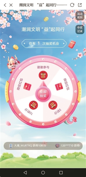 据了解,“潮润文明‘益’起同行”绿色出行公益活动还会开启捐步抽奖活动。在第一轮中,活动发放了现金红包,上架了华为蓝牙耳机、米家吹风机和米家毛球修剪器作为兑换好礼,让人动力满满。