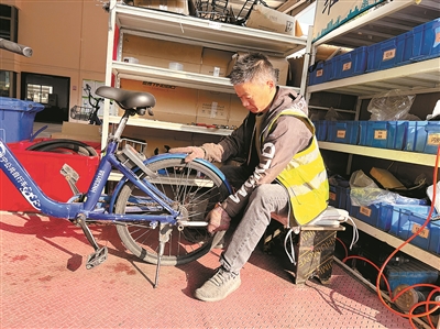 在这里工作了4年的冯平兴,早已摸透这些“小蓝车”的症结。“别看这些车结构简单,刹车、轮胎、坐垫这些部位最容易损耗,修起来一点都不能马虎。”他一边利落地调整刹车线,一边向记者介绍。目前,像冯平兴这样的维修人员,基地共有6位,平均每人每天保养、维修超过20辆“小蓝车”。