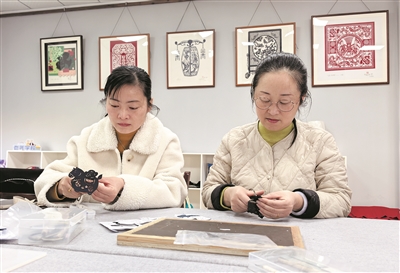 蒋叶萍(右)正在制作小马剪纸。