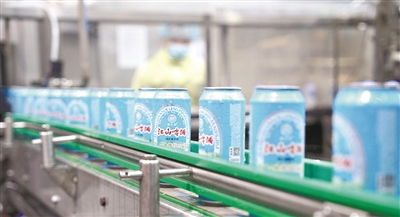 9月12日,浙江倬云生物科技有限公司自动化生产线上,一瓶瓶贴有 “江山啤酒” 标识的产品有序流转。退出市场三十多年的“江山啤酒”于今年8月21日重新投入生产,目前市场反馈良好。记者 余晓展 报道组 蒋君 摄