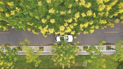 近日,江山市城乡道路两旁种植的黄山栾树陆续进入盛花期,绿叶、黄花与红果色彩斑斓,将道路装扮得如诗如画。图为车子行驶在江山市区文苑路城北中学附近。通讯员 严学明 摄
