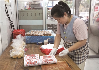 9月21日,在江山市区云宾路的一家食品作坊内,店老板正在对刚出炉的月饼进行包装。据了解,纯手工制作的月饼香甜松软,加之包装简约、价格亲民,约400克每筒的月饼价格在15元左右,深受市民喜欢。通讯员 姜层层 摄