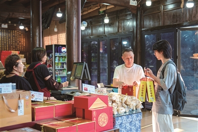 近段时间,在衢州古城水亭门历史文化街区的百年老字号“邵永丰麻饼”门店,各种口味的麻饼和月饼畅销。店员介绍,随着中秋节的临近,门店每日销售额与往日相比增长至少二三倍。记者 刘芸 摄