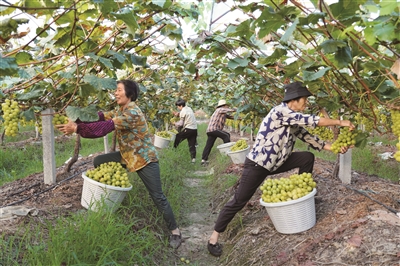 连日来,江山市上余镇吉源家庭农场葡萄种植大棚里,果农们穿梭在葡萄架下,小心翼翼地采摘葡萄。该农场今年种植葡萄面积80亩,品种以夏黑、蓝宝石、阳光玫瑰为主,预计可产葡萄160吨。