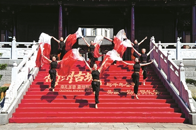 9月30日,衢州古城水亭门历史文化街区装扮一新,舞者在天王塔台阶前灵动起舞。