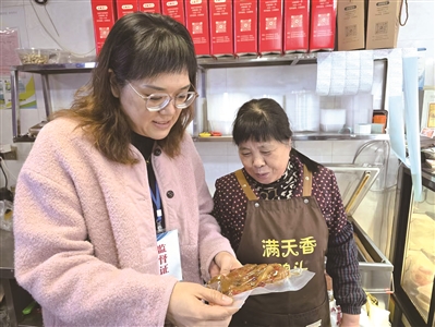 11月10日,柯城区府山街道府山社区纪检监察联络站工作人员(左)走访马站底餐饮商户,提醒商家依据“衢州鸭头”地方标准做好鸭头品质,共同打响衢州鸭头品牌。记者 方俊 通讯员 朱慧雯 摄
