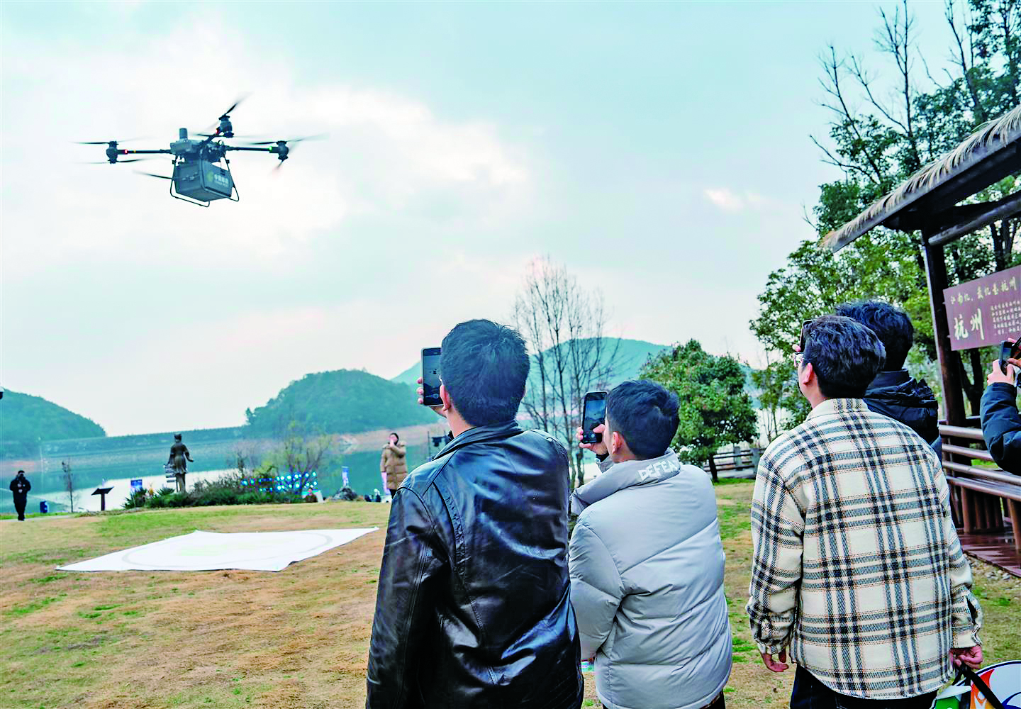 3月6日下午4时30分,一架装载200枝鲜花的邮政无人机从华东(金华)水果市场无人机物流金华枢纽站平稳起飞。10分钟后,无人机平稳降落在海拔600米的鹿女湖畔“金华山音乐交友会”活动现场。下午6时,邮政无人机再次“惊喜”降落,为参加音乐会活动的一群年轻人,运来了还在滋滋冒油的烤全羊。“这也太潮了!刚来那会在无人车里取了盲盒,现在收到了无人机送的花和烤全羊!”市民小徐说这“丘比特”科技感十足。 本报记者 傅俊 文/摄