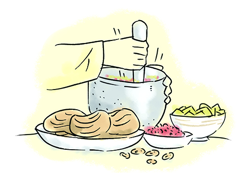 看着热气腾腾的糯米饭蒸熟后出笼,一群孩子走向厅堂里的捣臼。看大人把蒸好的糯米饭倒入捣臼里,一个壮劳力脱掉厚重的外套,挽起衣袖,卖力用木杵使劲地舂,另一个人双手在温水里一浸,最后双手在木杵顶端一捋,那是为了防止麻糍黏在抡锤上,然后麻利地把摊在捣臼底下的米粉捋在一起,而木杵一起一落,双手一浸一捋,两人配合默契,直至把那一大团饭团搡成柔软而具有韧劲的米粉团为止。