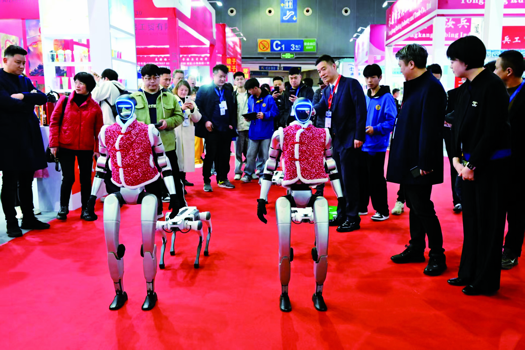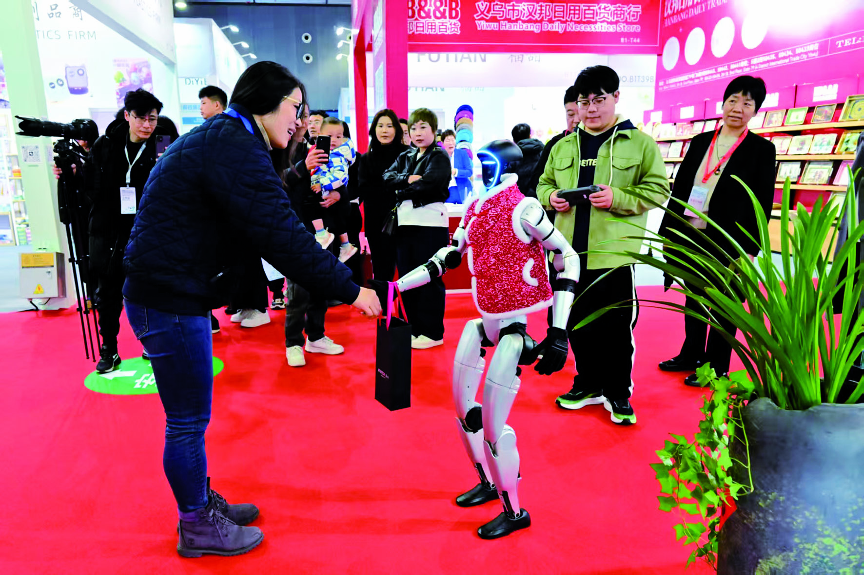 3月14—16日,一款人形机器人在义乌国际博览中心举行的“义乌百货创新展”上亮相,展示AI智能机器人提物行走、与人互动等应用场景,现场众多客商与其互动,感受前沿科技的魅力。 通讯员 时补法 文/摄