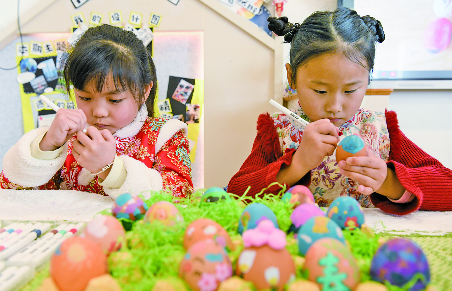 3月20日,春分时节,婺城区北苑幼儿园开展“春分立蛋”主题民俗活动。小朋友们通过“绘彩蛋”“立蛋”等活动了解春分相关民俗,感受节气传统文化。 时宽兵 文/摄