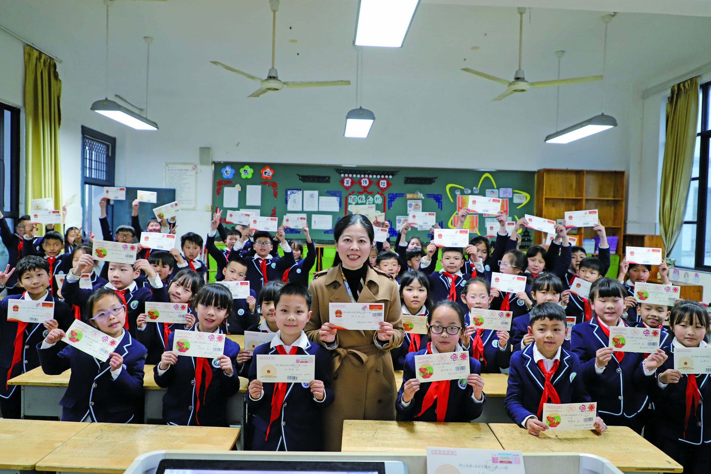 参会期间,祝响响将这批全国两会纪念封、原地封从全国人大会议中心寄出。寄出前,她拿着纪念封在人民大会堂留了影。回到浦江,在课堂上,她在电子屏上打开人民大会堂的照片,人手一张纪念封,和同学们一起合了影,同学们仿佛身临两会现场。与此同时,她还分享了参加全国两会的所见所闻、所思所想。“收到一份来自全国两会的礼物,很意外也很惊喜,通过祝老师的讲解,我感觉这份礼物的特殊意义,也感受到全国两会其实离我们并不遥远。”三(6)班学生王俊楠说。