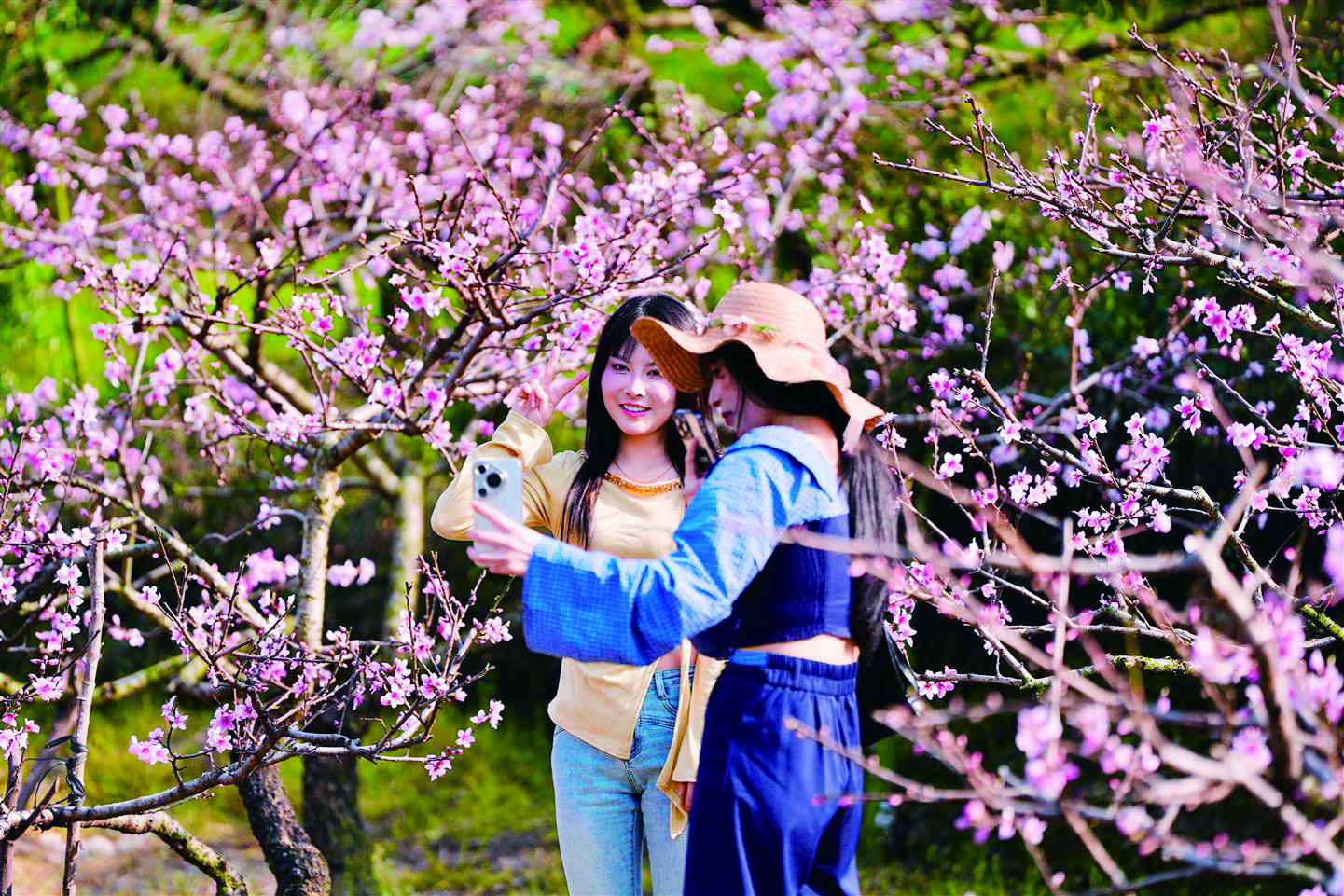 日前,义乌市上溪镇桃花坞村千亩桃花进入了观赏期,漫山遍野的桃花竞相绽放,粉霞如海,吸引了大批游客前来踏春赏花、拍照打卡,沉浸式感受春日烂漫。 本报记者 俞佳妮 摄