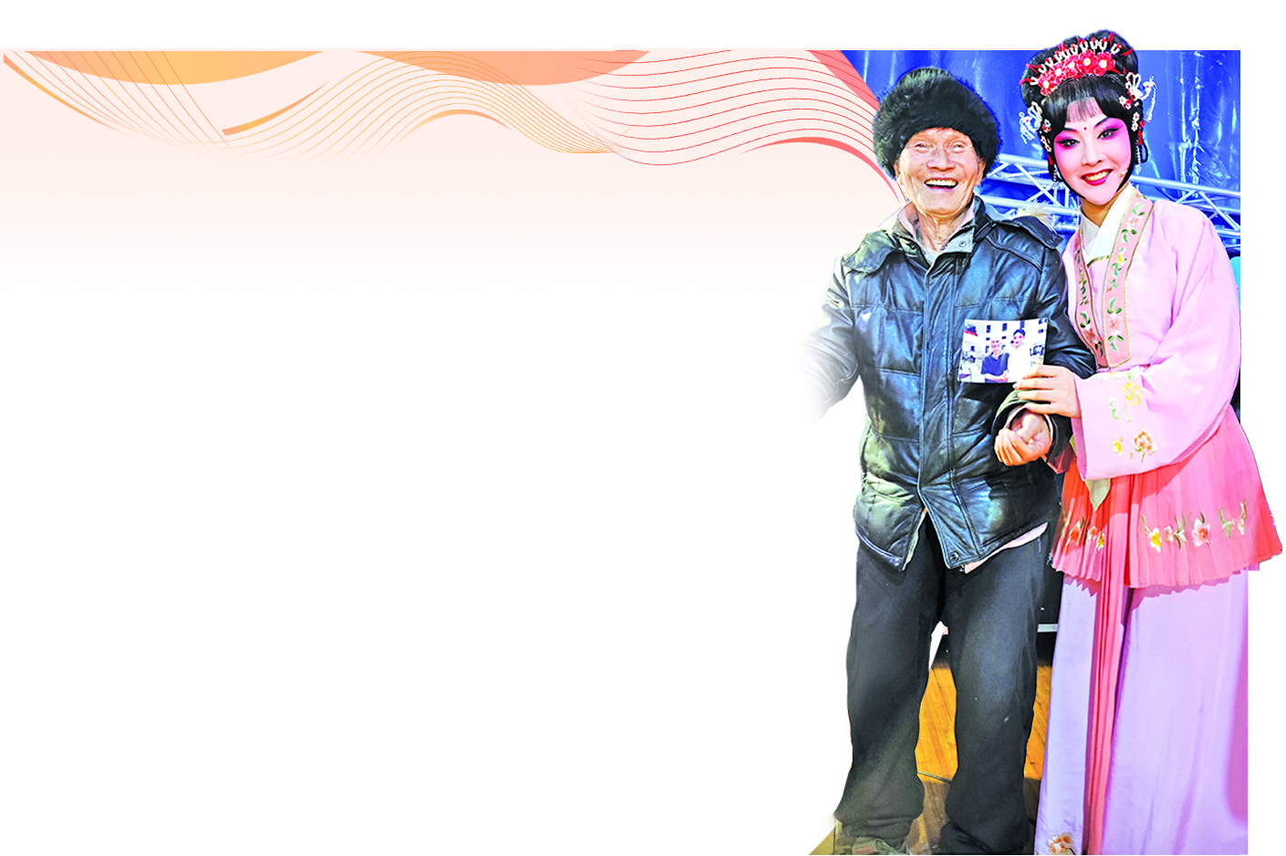 吴立冬说,上周他们村请来永康中百婺剧团演出,他外公吴宝水是老戏迷,五天五夜的戏,白天场场不落,有一天晚上也要坚持去看戏。“92岁了,又拄着拐杖,一般晚上我们不让他出门的,担心他身体吃不消。”那晚剧团演的是《绣花女传奇》,外公看得津津有味。看着看着,他发现台上有一个演丫环的演员跟两年前来演过戏的小演员很像。“当时她演的丫环角色活灵活现,让人印象深刻,我外公还跟她合了影。”吴立冬也很兴奋,跟剧团确认是同一个演员后,赶忙跑回家取了外公跟她第一次合影的照片,然后扶着外公走到后台跟小演员合影,“这次拍照的站姿和手势跟第一次一模一样,只是外公今年拄了拐杖,而小演员更成熟了”。