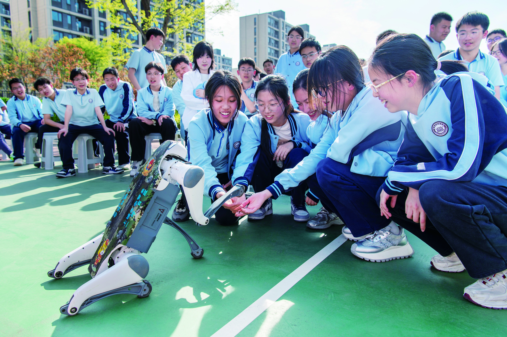 近日,市区一中学校园内,学生在观摩一只消防机器狗的表演。今年以来,市区不少中小学校开展科技进校园活动,让学生和机器人、机器狗近距离接触,真切感受科技的魅力,激发青少年的科技梦想。 本报记者 胡肖飞 文/摄
