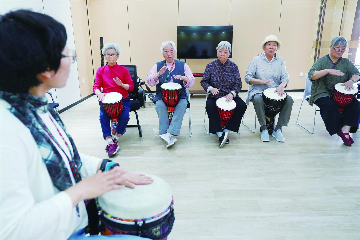 昨日,在金东区福利中心活动室内,非洲鼓俱乐部的爷爷奶奶正忙着练习新曲《桥边姑娘》。只见老人们随着培训老师的口令击打着鼓面,融入到欢乐的音乐海洋中。 本报记者 傅俊 文/摄