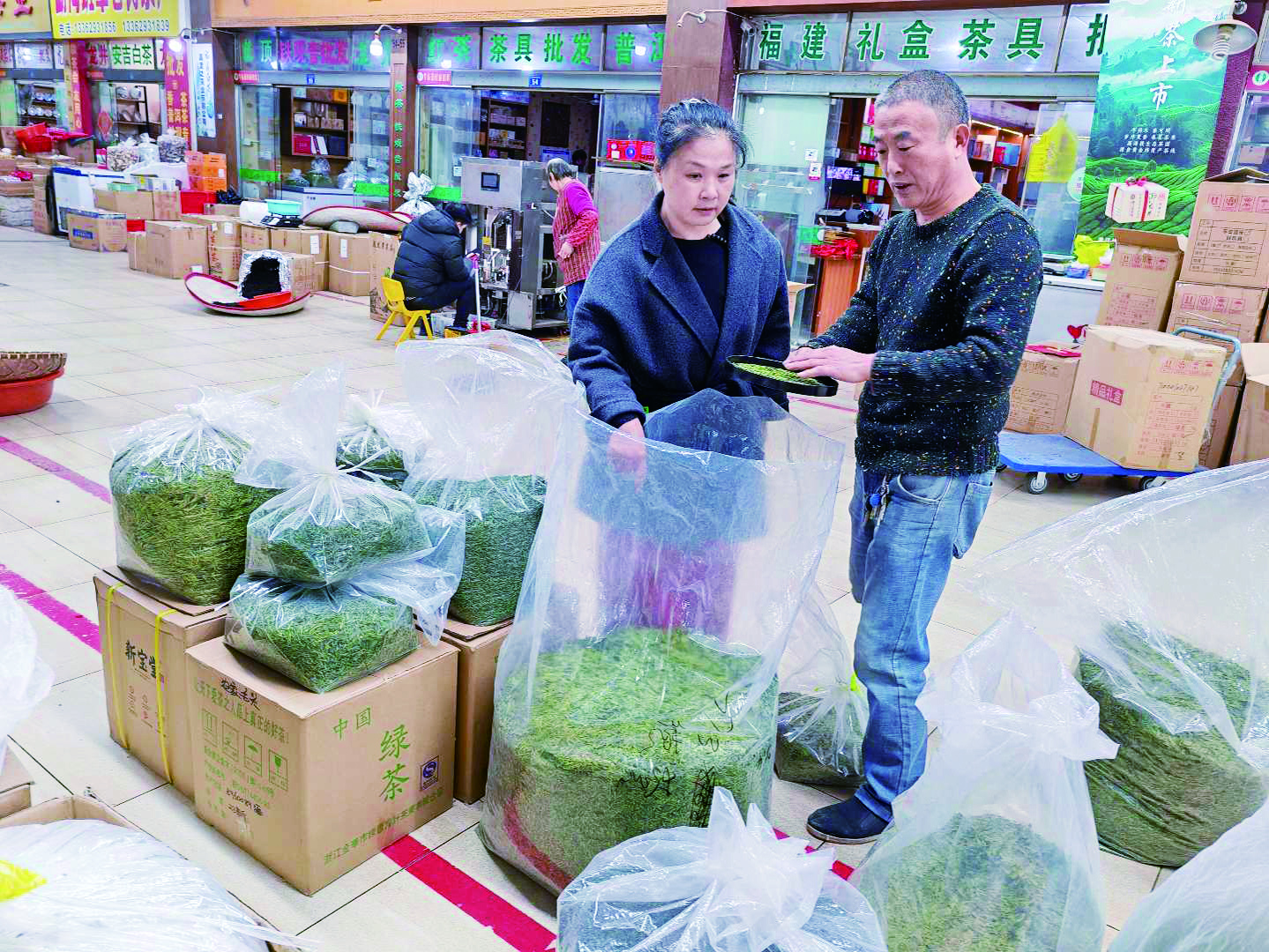 绿雪顶针茶叶有限公司门店前摆满了不同产地、不同工艺和不同价位的新茶,员工们正忙着给顾客称量、包装。店主周德营介绍,本地新茶一周前开始陆续上市,目前算上发往外地的量,平均每天能销售数百公斤。