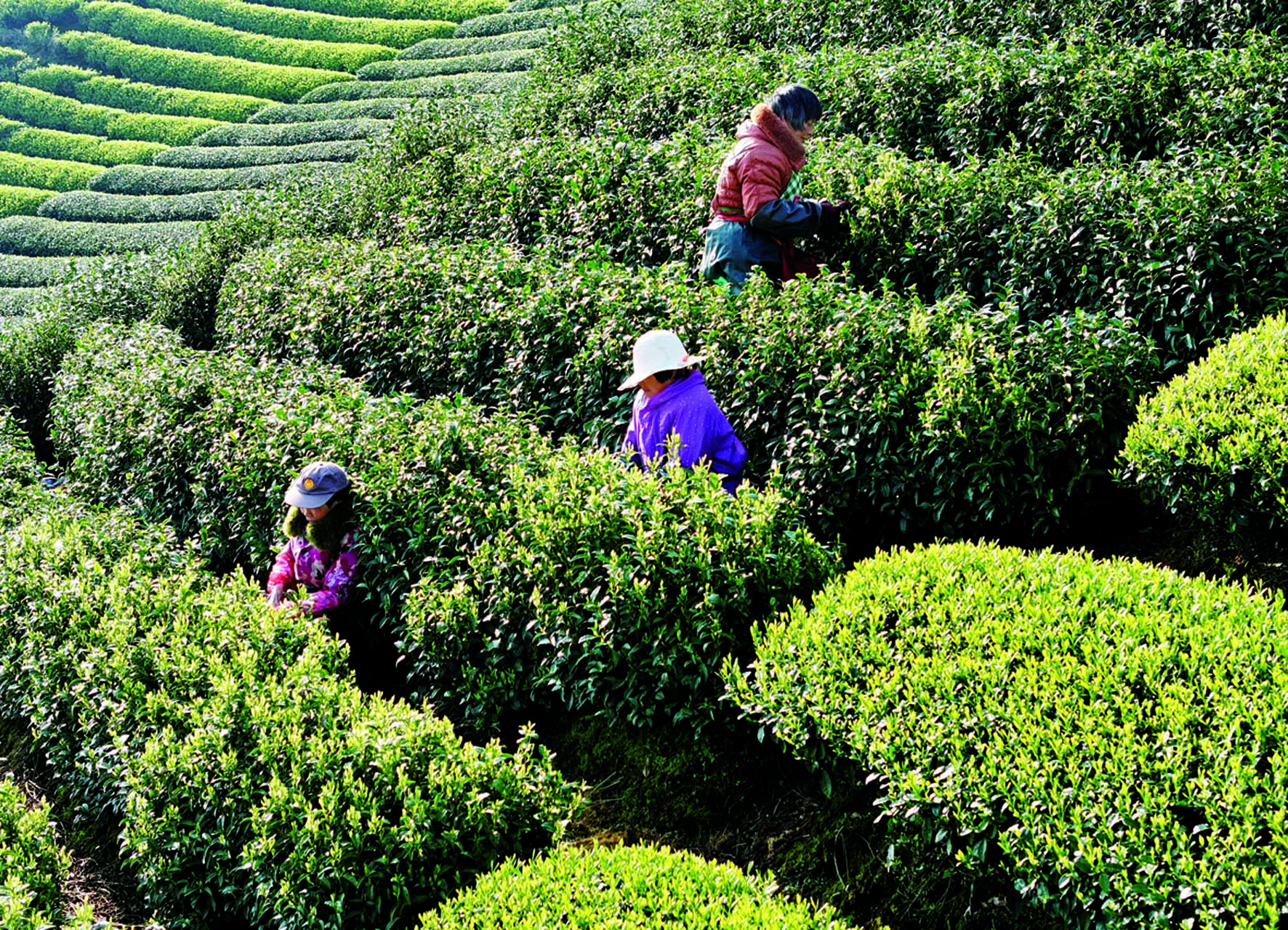 随着清明节临近,武义县12万亩茶园新芽勃发、满山翠绿。昨日在壶山街道正新屋村,茶农在石鹅湖茶园抢采明前茶。 通讯员 张建成 李云升 文/摄