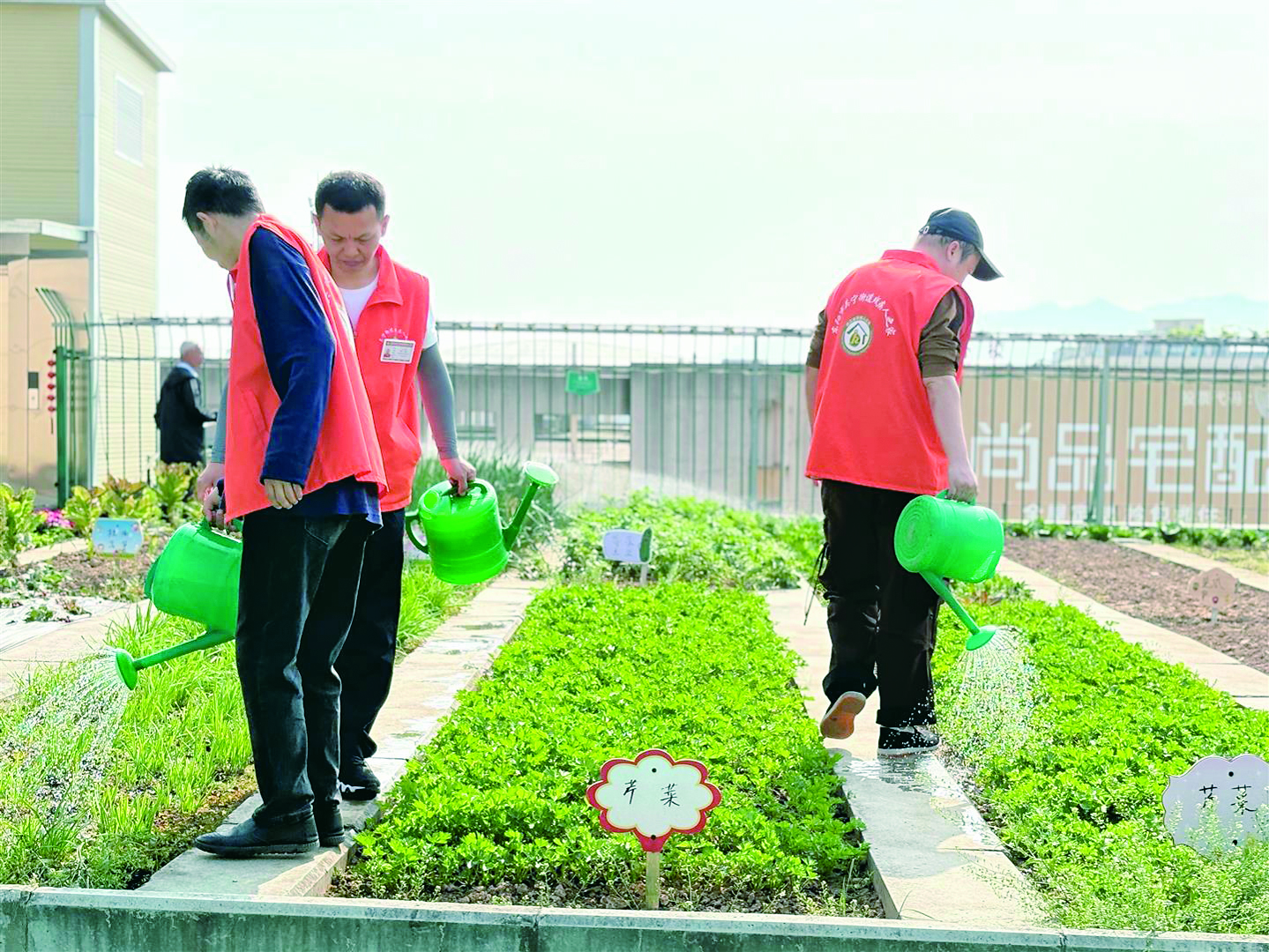 昨日,春日的暖阳洒在东阳市吴宁街道残疾人之家楼上的一块特殊基地上,春风轻轻吹过,带来泥土与蔬菜混合的清新味道。王科威等8名庇护对象在楼下卖完早上刚收的蔬菜后,又在基地农田里忙开了。他们一边用水壶给冰草、孔雀菜、芹菜和红叶菜等蔬菜浇水,一边盼望着下一个周五的到来。 自从今年2月17日来到吴宁街道残疾人之家,每周五的义卖活动成了他生活里的一件大事。每到这天,他和伙伴们会仔细整理好基地的蔬菜,小心翼翼地搬到一楼,然后带着点羞涩,又充满热情地向路过的居民吆喝,盼着大家能认可他们的劳动成果。