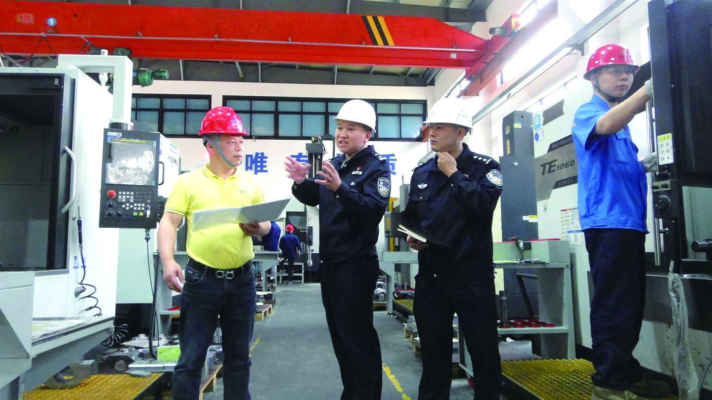 企业发展,警长助力。东阳市公安局巍山派出所持续优化“车间警长”服务举措,做深做实“共富警务”。图为日前“车间警长”走访企业宣讲反诈。 徐步文 摄