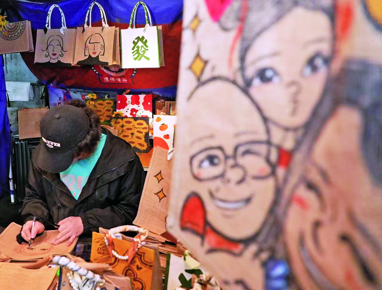 @奔跑的快乐:在义乌三挺路夜市,摊主小哥现场手绘定制版布包,将顾客的卡通形象定格于布面之上。 陈斌 文/摄