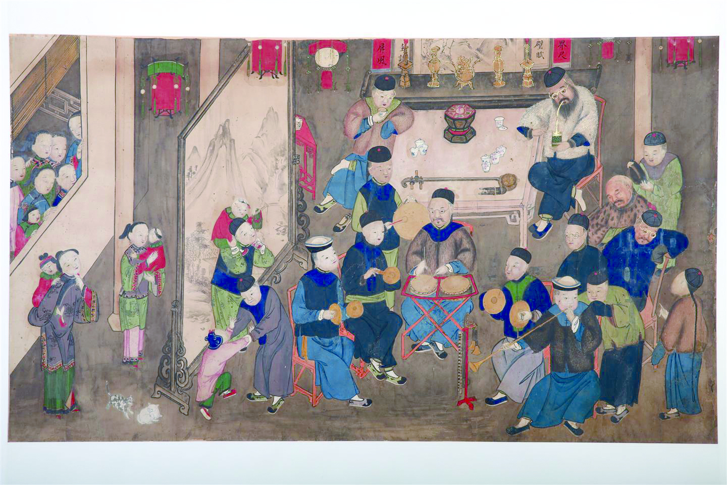 《坐唱图》描绘的是浦江什锦班的演出场景,演奏团队位于画面中间略偏右下方,敲鼓、打锣、吹号,一应俱全。听戏者姿态各异,坐着的、站着的、带着孩子的,还有人从窗户探进脑袋来听,人们姿态各异,画面很生动。