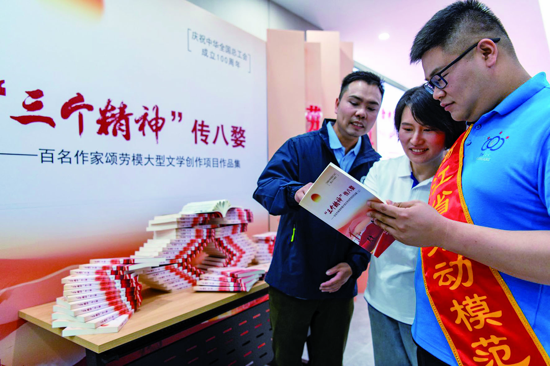 4月28日下午,在以“弘扬‘三个精神’ 凝聚八婺力量”为主题的金华市庆祝“五一”国际劳动节活动现场,新书《“三个精神”传八婺——百名作家颂劳模大型文学创作项目作品集》重磅亮相。百名作家与百名劳模工匠结对,通过面对面、心贴心的交流,深度挖掘劳模工匠背后的故事。 本报记者 卢奕仿/文 胡肖飞/摄
