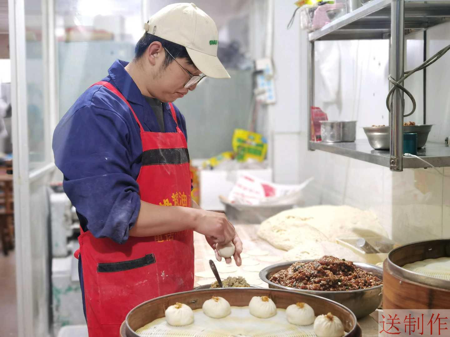 方成芳的包子店开在市区双馨路,附近不少居民都是这里的老顾客。方成芳开工的时候,这座城市还未苏醒,他妈妈通常跟他一起过来,进入里面的操作间,先把白米粥煮上,然后开始磨豆浆,做豆腐脑、豆腐等。再晚一些,他爸爸和另外的帮工也来了,大家各司其职,应对早餐高峰期。
