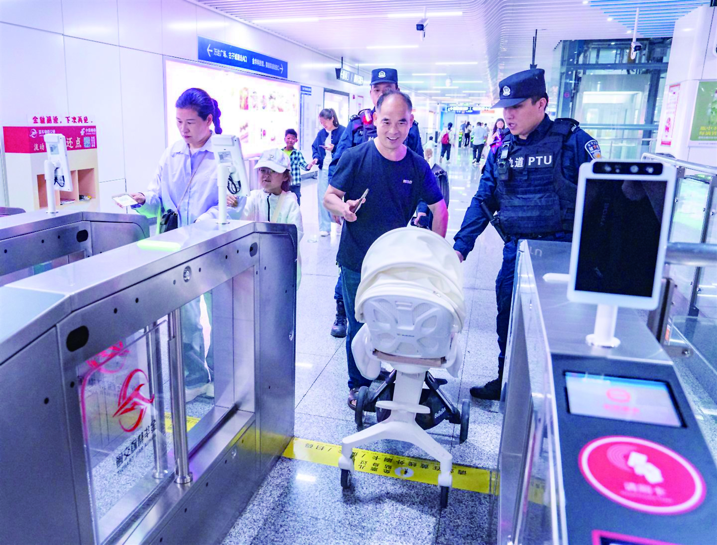 “五一”期间,金华轨道公安扎实开展巡逻防控、隐患排查和服务乘客等工作,全力保障轨道交通运营安全和乘客平安出行。 “五一”当天,我市轨道交通全线输送客流突破28万人次,再创客流高峰。在游客扎堆的明清宫站,实时监控画面里,穿藏蓝警服的民辅警几乎被人群淹没,手里的扩音器每隔十秒就要重复一次:“前往明清宫的游客,请从B口出站乘坐公共交通。” “‘五一’假期,来金华游玩的旅客明显增多,列车到站时,像金华南站、金华站的瞬时客流比较大,容易出现拥堵的现象。”执勤民警说,“在这些站点我们就得多引导、多宣传,才能保证旅客出行安全。”据了解,“五一”期间,轨道公安提前部署,在一些客流量大的站点增设警力进行引导,协调车站放置隔离栏,同时配合运营公司加开列车延长运营时间,保障旅客出行。 本报记者 傅俊 文/摄