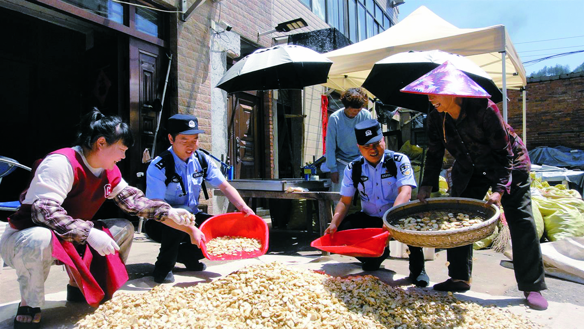 农忙时节,金华公安不断精耕共富警务,在安农、护农、利农方面下功夫。左图为浦江交警在仙华街道道光村,结合群众出行特点,向劳作农户讲解交通安全注意事项。上图为东阳市公安局千祥派出所针对眼下农户忙着抢收中药材的情况,由“背包警长”每天走村串户,和农户一起采挖、清洗、切片、晾晒中药材,同步排查化解纠纷、宣讲防范电诈,确保增收增效。 杨晓东 徐步文 摄