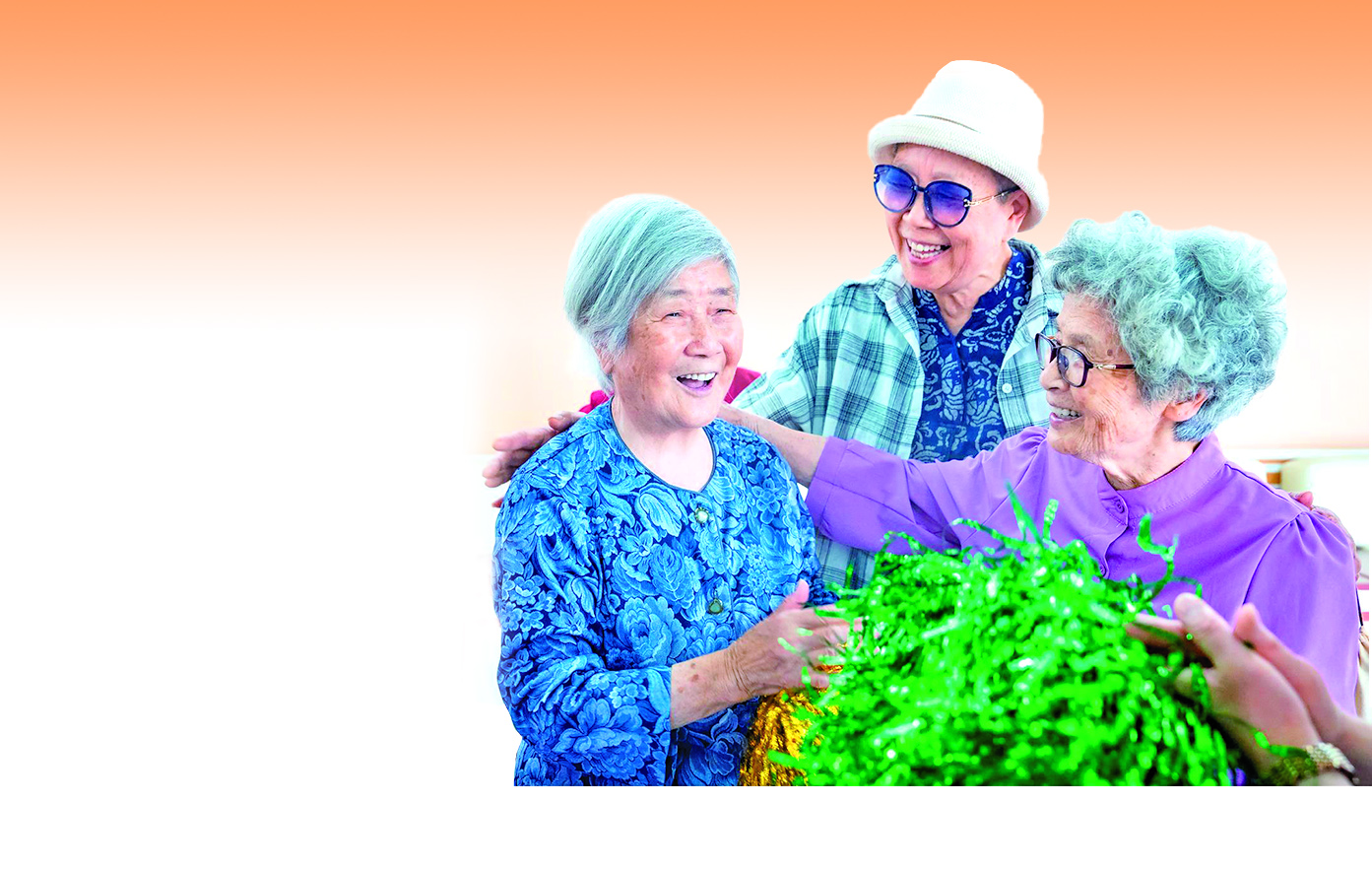 记者见到俞惠钿(如图,左一)时,她正在中心工作人员的带领下,与其他老人一道参加新伙伴迎新活动。