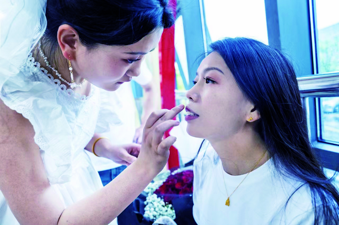@520:在婺城区民政局婚姻登记处,戴着头纱的方慧娴正在给姐姐化妆。“我跟姐姐相约同一天来登记,要一起甜蜜。” 傅俊 文/摄