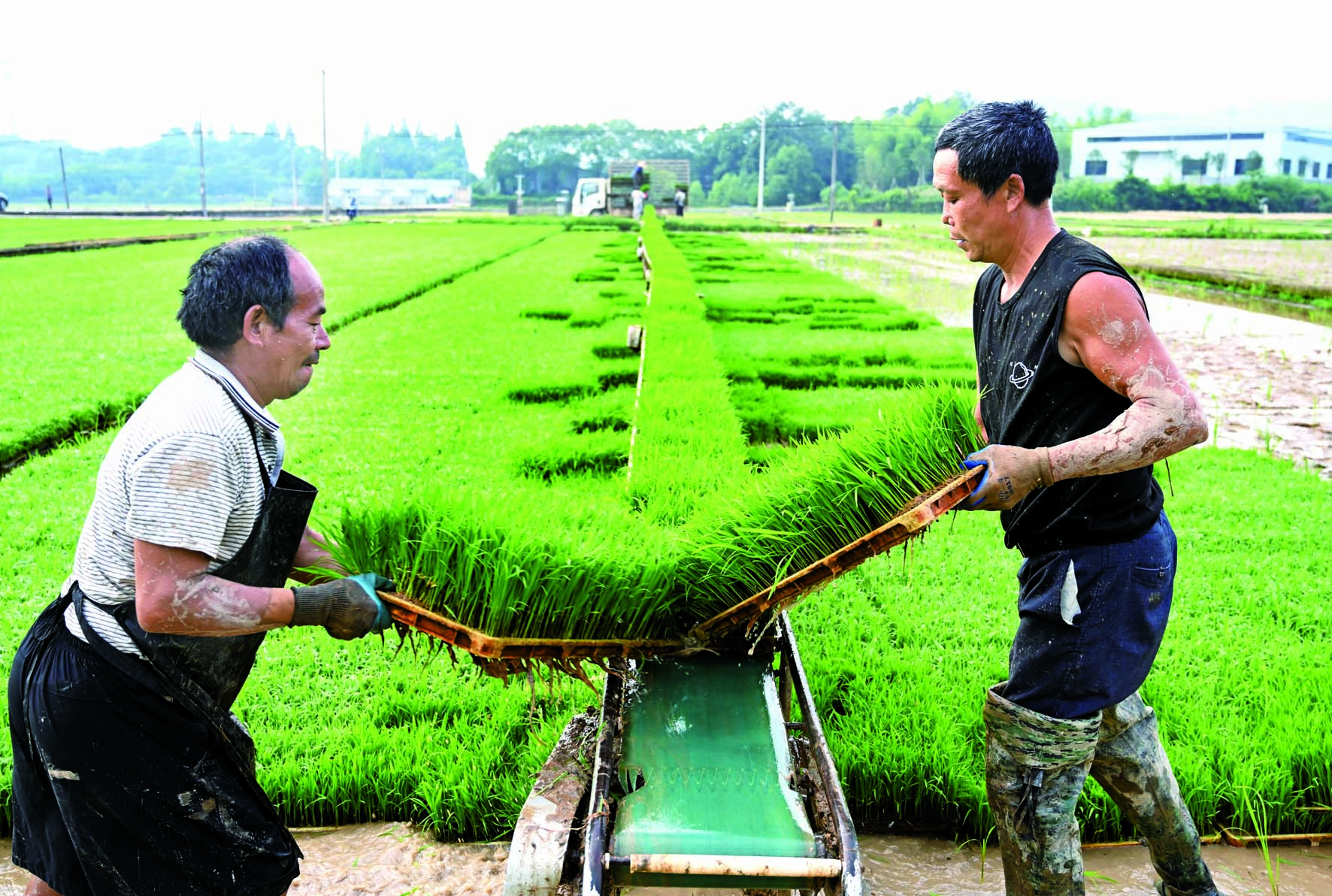 连日来,武义县王宅镇仁村育秧工厂,农户身上裹满泥浆,忙着在输送线上为种粮大户运秧苗。 通讯员 张建成 李云升 文/摄