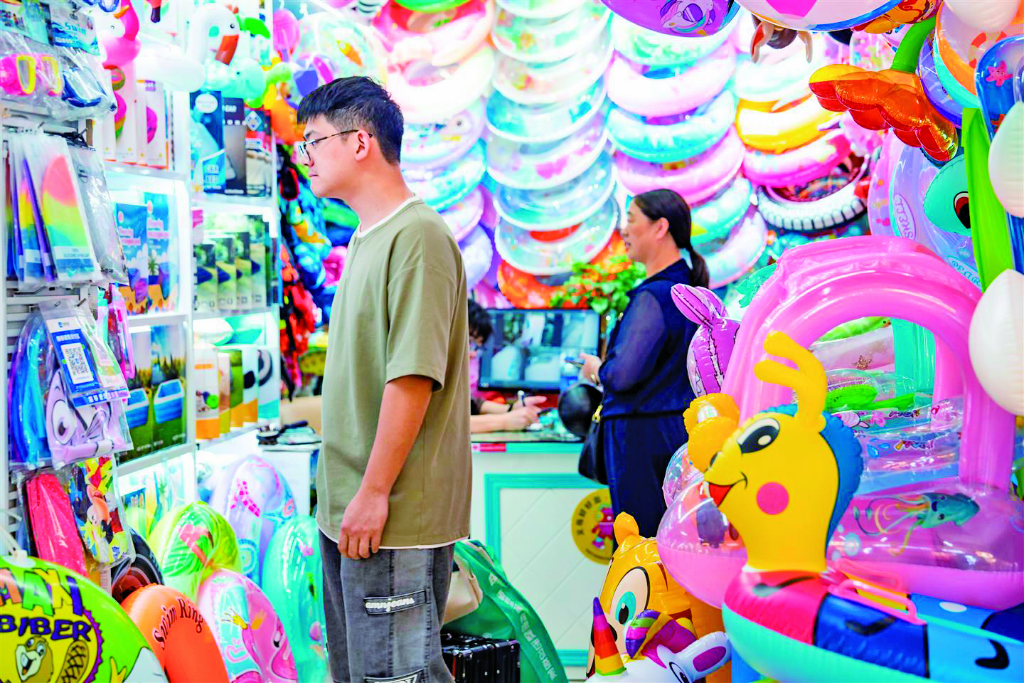 闷热的天气,与即将到来的暑假,带动了“亲水经济”升温。昨日,记者在义乌国际商贸城一区看到,不少游泳用品销售店铺里陈列着琳琅满目的泳具,从基础款泳衣泳裤到专业泳镜泳帽,从儿童游泳圈到高端潜水设备一应俱全。 本报记者 傅俊 文/摄