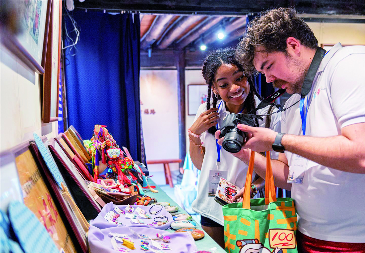 华盛本大学学生米卡亚·库布勒初入坛头村,首先吸引她的是丰富的业态。“我没有想到,中国乡村可以喝咖啡、逛书店、看展览。”在坛头村畲族文化馆,她试戴了畲族传统服饰。她此前从未见过这么漂亮的民族服饰,各式各样色彩丰富的陈列品让她和朋友们赞叹不已,体验时还不忘拿出手机与身着全套畲族服饰的村民合影留念。