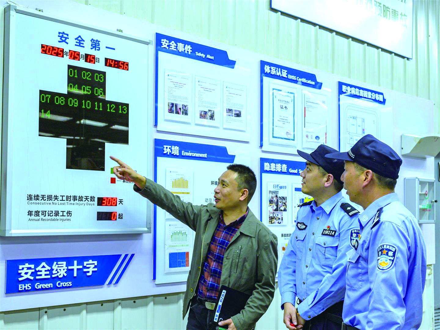 连日来,金华市公安局江南分局秋滨派出所组织警力对辖区企业生产区域进行“把脉问诊”,对存在的问题及发现的隐患现场帮扶整改。图为秋滨派出所民警在辖区某化工企业进行安全检查。 王雨佳 摄