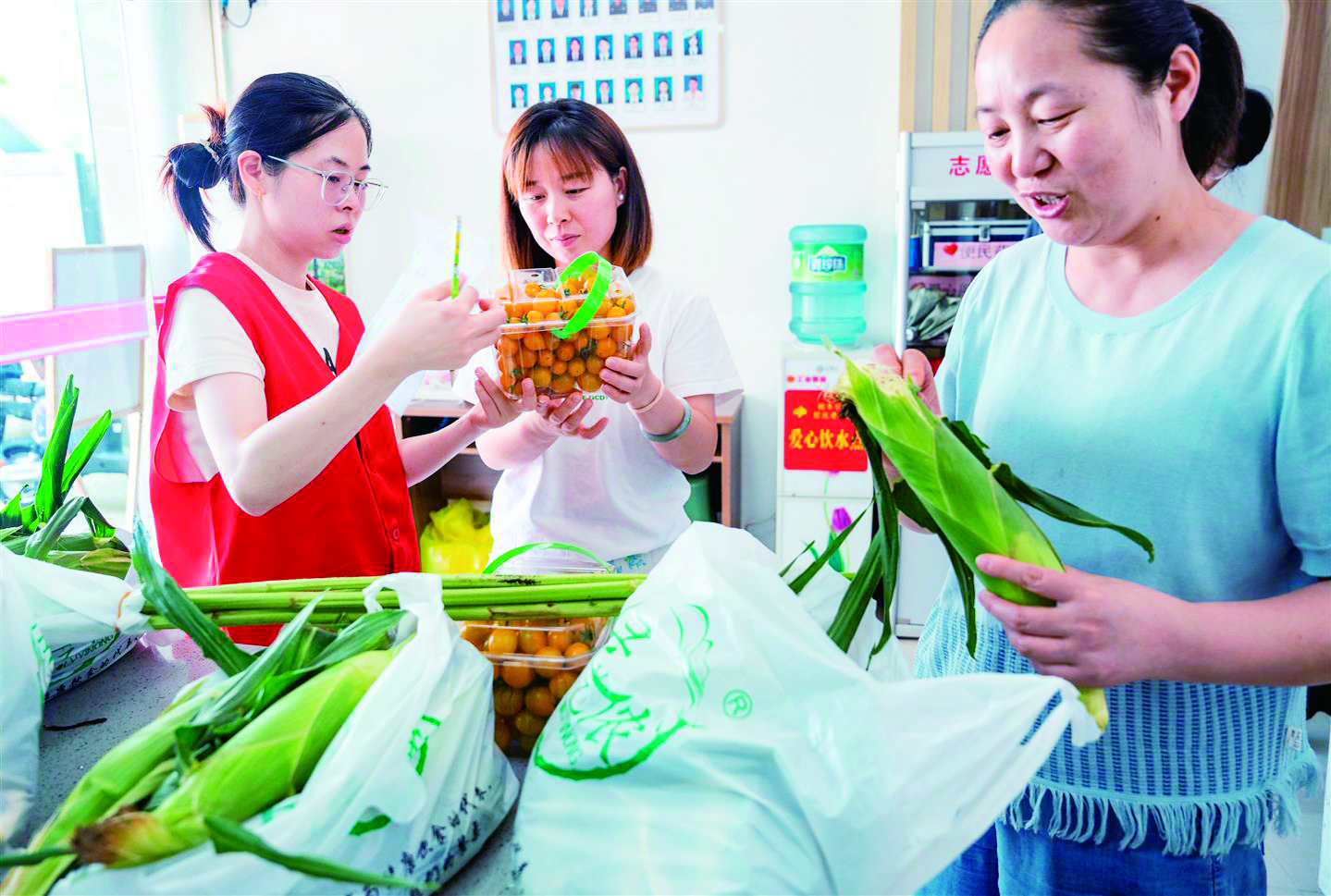 昨日,在婺城区城北街道祝丰亭社区里,社区工作人员为居民们整理、分发早前预订的公益助农的莘畈乡文森特向日葵,琅琊镇冷水茭白、七彩土豆、水果玉米等农产品。 据了解,活动由城北街道牵头莘畈乡、琅琊镇共同举办,旨在搭建起街道和乡镇之间互动的桥梁,让优质的农产品能够直接走进市民的家中。 本报记者 傅俊 摄