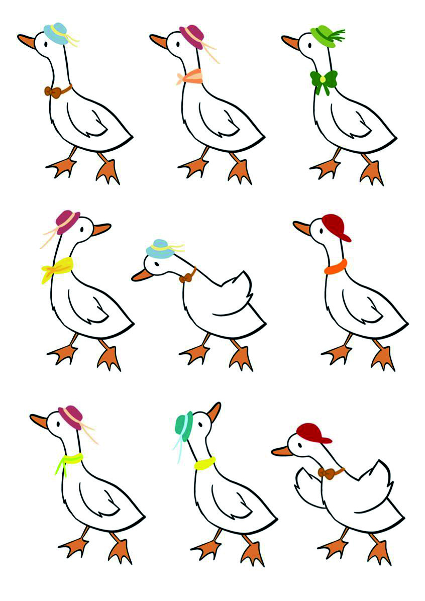 作者:金华职业技术大学师范学院 周巧玲 小鸭子们穿着各式各样的衣服去参加毕业典礼的演出,但是有2只小鸭子穿了一样的衣服。请仔细的小朋友,找到它们并用笔圈出来吧!