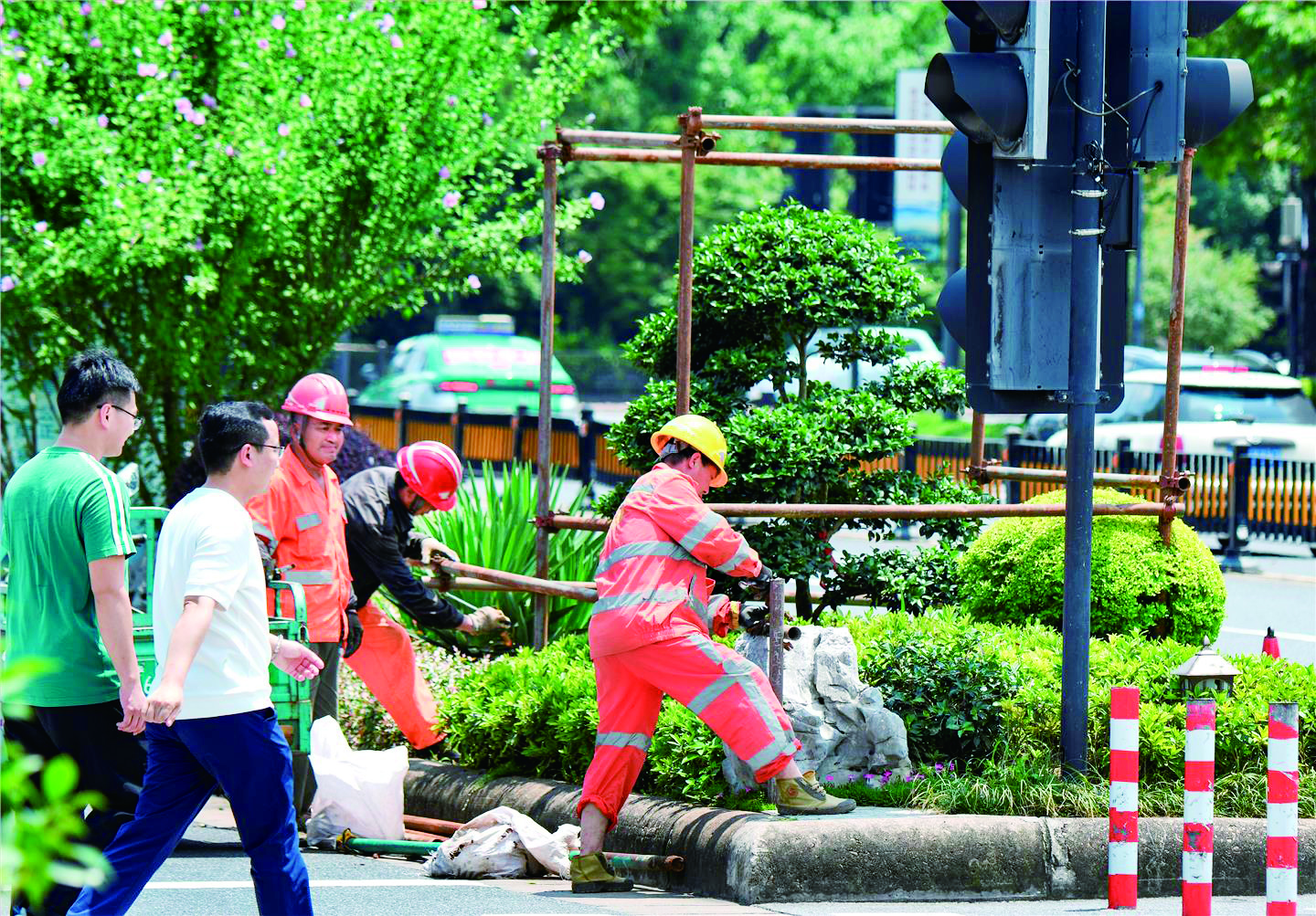 日前,市区东市北街上,园林工人给一些“怕热”的花木搭上架子,预备过几日加盖遮阳网,应对即将到来的暑热天气。 本报记者 李建林 文/摄