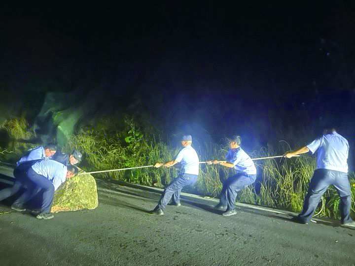 6月21日晚,夜色渐深的山道上,一阵号子声划破寂静长空。十几分钟前,一块从山坡滑落的巨大山石,横亘在蜿蜒山路的中央。金东公安分局澧浦派出所民辅警咬紧牙关,绳索深深勒进掌心,汗水浸透藏蓝警服,齐心协力将这“拦路虎”挪到了路边。