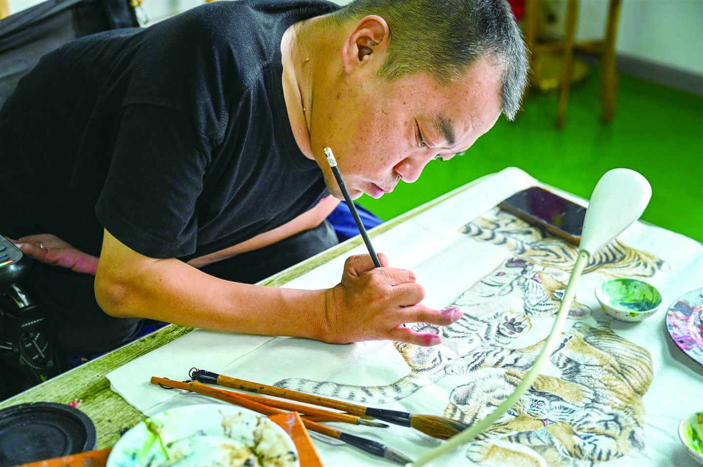 走进城西街道残疾人之家,活动室内摆放着一张专门为赵智斌定制的书桌,桌上放置着粗细不同的画笔,几个调色盘,还有一台风扇和一盏台灯。“因为行动不方便,残疾人之家特意为我做了这张桌脚较低的桌子,方便我画画。”赵智斌说,生活虽有太多磨难,但坚持画画总能给他带来惊喜。“之前在江苏无锡的时候,在好心人的帮助下,我的画给我带来了一笔不小的收入。这次能够获奖也是意料之外。”
