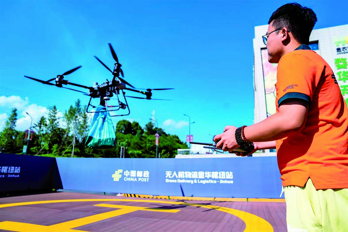 昨日,一架无人机在婺城区罗店镇盘前村空地的起降点缓缓降落,装上刚采摘的新鲜蔬菜,沿着既定航线向10公里外的华东(金华)农产品寄递共配中心飞去,将过去需耗时1个小时的路程压缩至13分钟左右。 本报记者 傅俊 文/摄