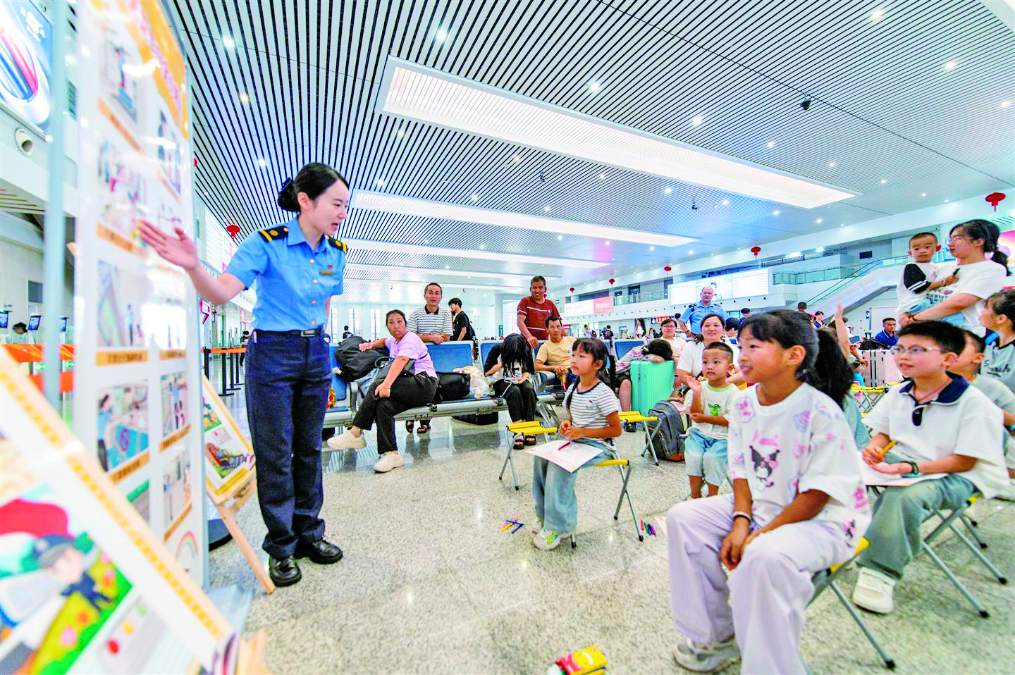 针对暑运期间儿童乘客的特点,日前,铁路金华站扩展服务内容,在候车区设置了“亲子候车区”,不定时组织开展暑期儿童乘车安全小常识宣传活动,通过蜡笔填画、抢答等形式,让孩子们在趣味互动中学习安全知识,共同提升安全防范能力。 本报记者 胡肖飞 文/摄